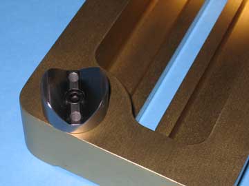 The front block is fitted with a long Vee Block which is used to securely hold the Ball Bar (Dumbbell). The front block will allow the Ball Bar (Dumbbell) to rotate a full 360° parallel to the vertical post, allowing a full range of positioning. Both of the blocks are hard anodized for wear resistance. The Single Ball Bar Clamp is four inches wide (4.0”, 101.6 mm).