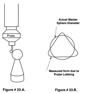 A very accurate sphere of well known diameter is used to establish the effective 3 Dimensional location of the probe tip center. The data derived from measuring this well known sphere is used by the C.M.M.'s computer to correct for asymmetric test probe lobbing, for all elastic deflections in the machines frame and for the bending of the probe tips shaft, see (Figure # 23. A. & B.).